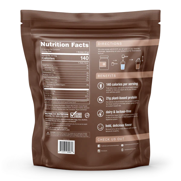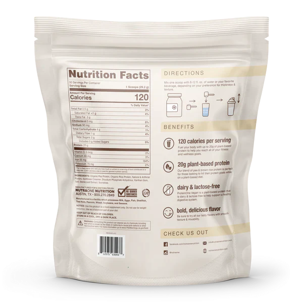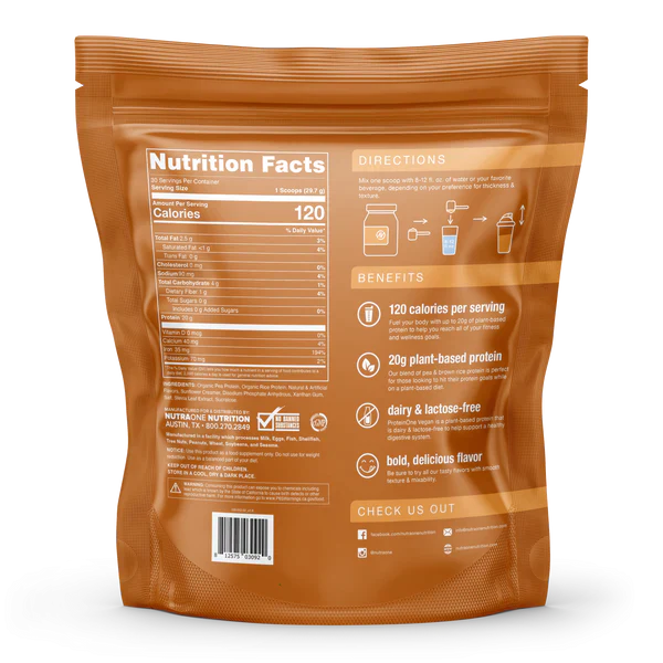 ProteinOne Vegan is our solution to reaching your protein needs without animal products. This plant-based protein has a smooth texture and comes in four delicious flavors. Easy to digest and provides 20 grams of plant-based protein.Directions: Mix one scoop with...